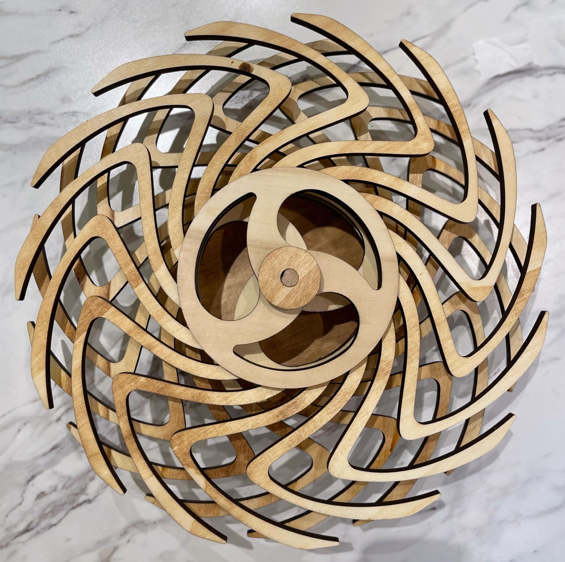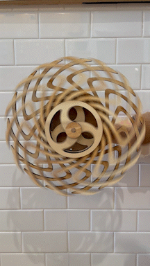 Enjoy the captivating visual display of this handmade wooden kinetic sculpture whirling windmill. Hang it in any room for a unique and eye-catching wall art piece that will surely draw attention. Perfect for adding a touch of modern charm to any décor. Experience the energy of kinetic art with the captivating beauty of wood! Spin by hand.