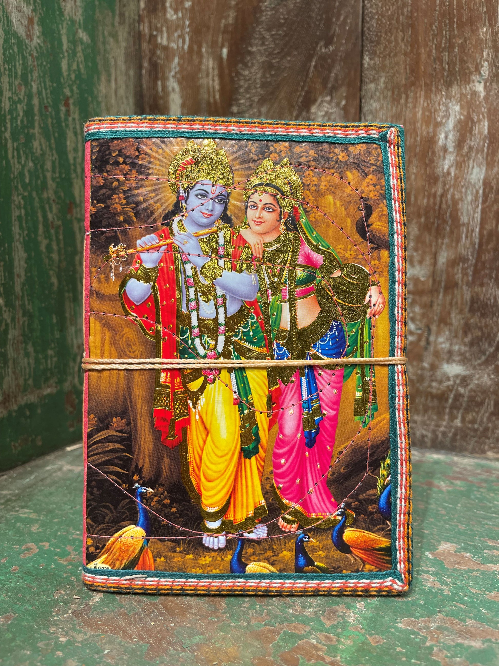 Handmade journal featuring different pictures of Radha & Krisha. Multi colored string wraps around for closure.