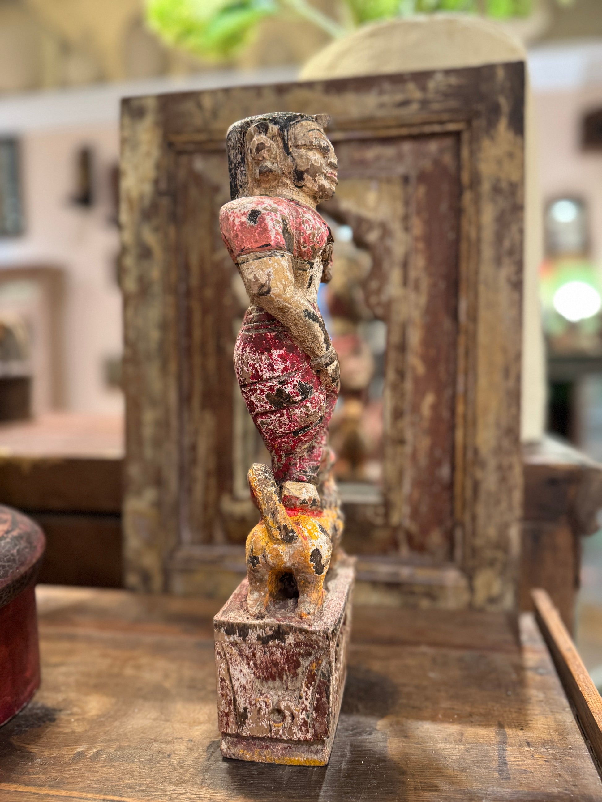 This charming hand-carved wooden figure captures a timeless moment—a lady accompanied by her faithful dog. Crafted from imported wood with a beautiful aged patina that speaks to its artisanal origins, this piece brings warmth and character to any room. Standing 13 inches tall with graceful proportions (4"W x 2½"D), it's the perfect size for a shelf, mantel, or display cabinet. A distinctive accent for collectors who appreciate handmade craftsmanship and vintage-inspired home décor.