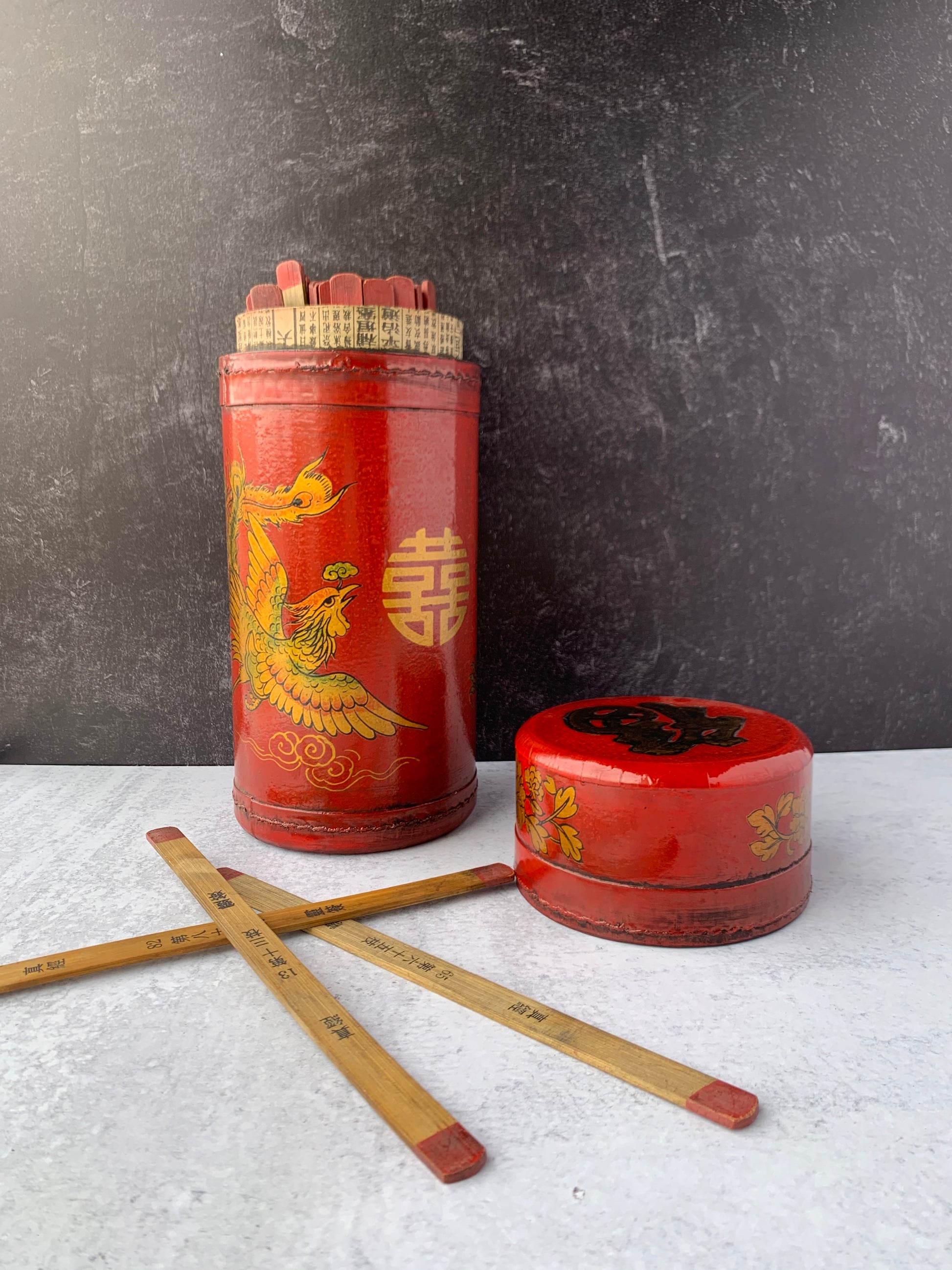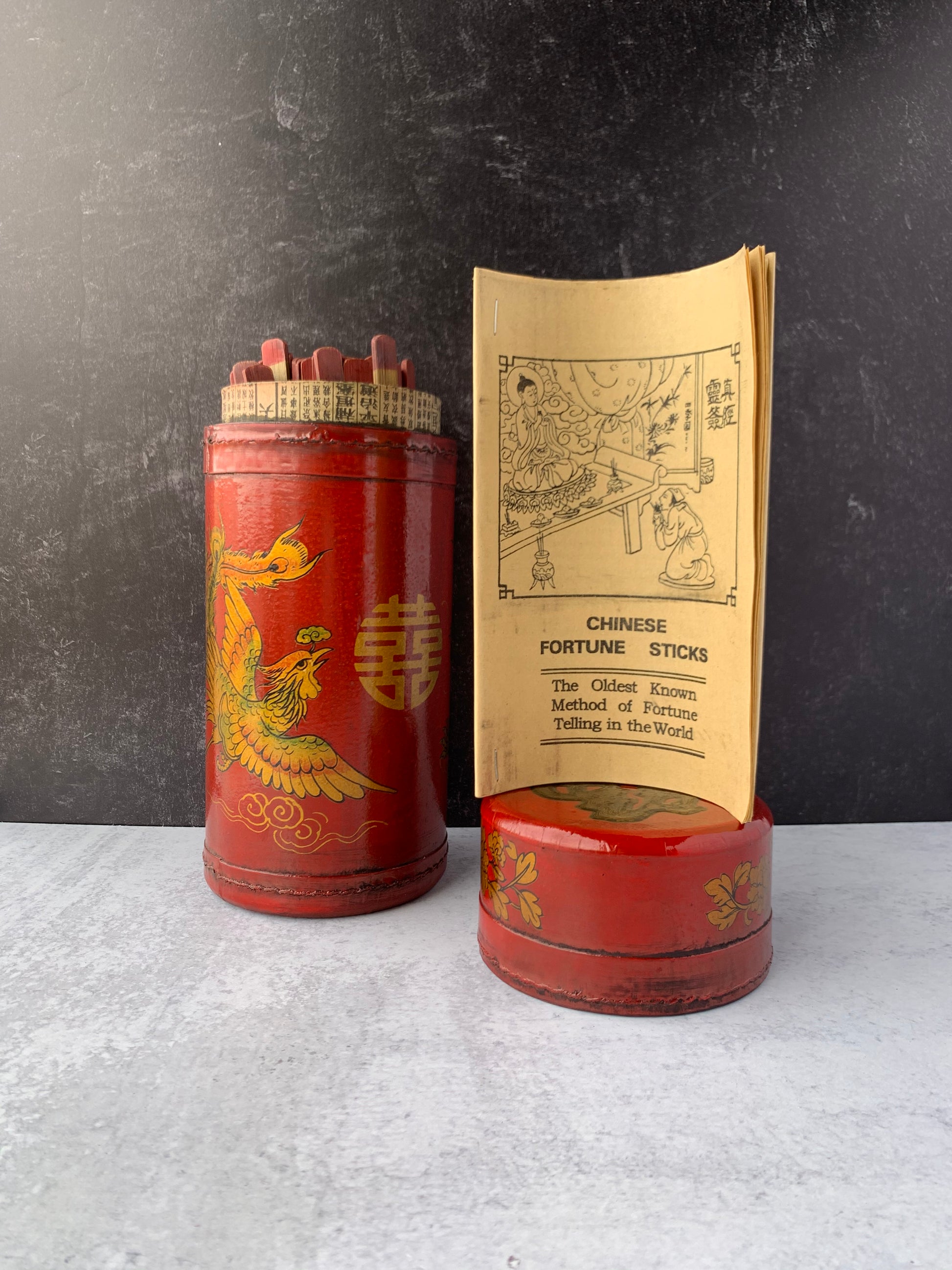 Fortune sticks are one of the oldest forms of fortune telling. Many times a Monk would hold it at an angle and shake until one would be further out. You would pick that one and match the number to the fortune in the book. This would be your fortune for the day. Really fun to have on a coffee table and it is a conversation piece with guests. The sticks are aged looking to match the history of the fortune stick.
