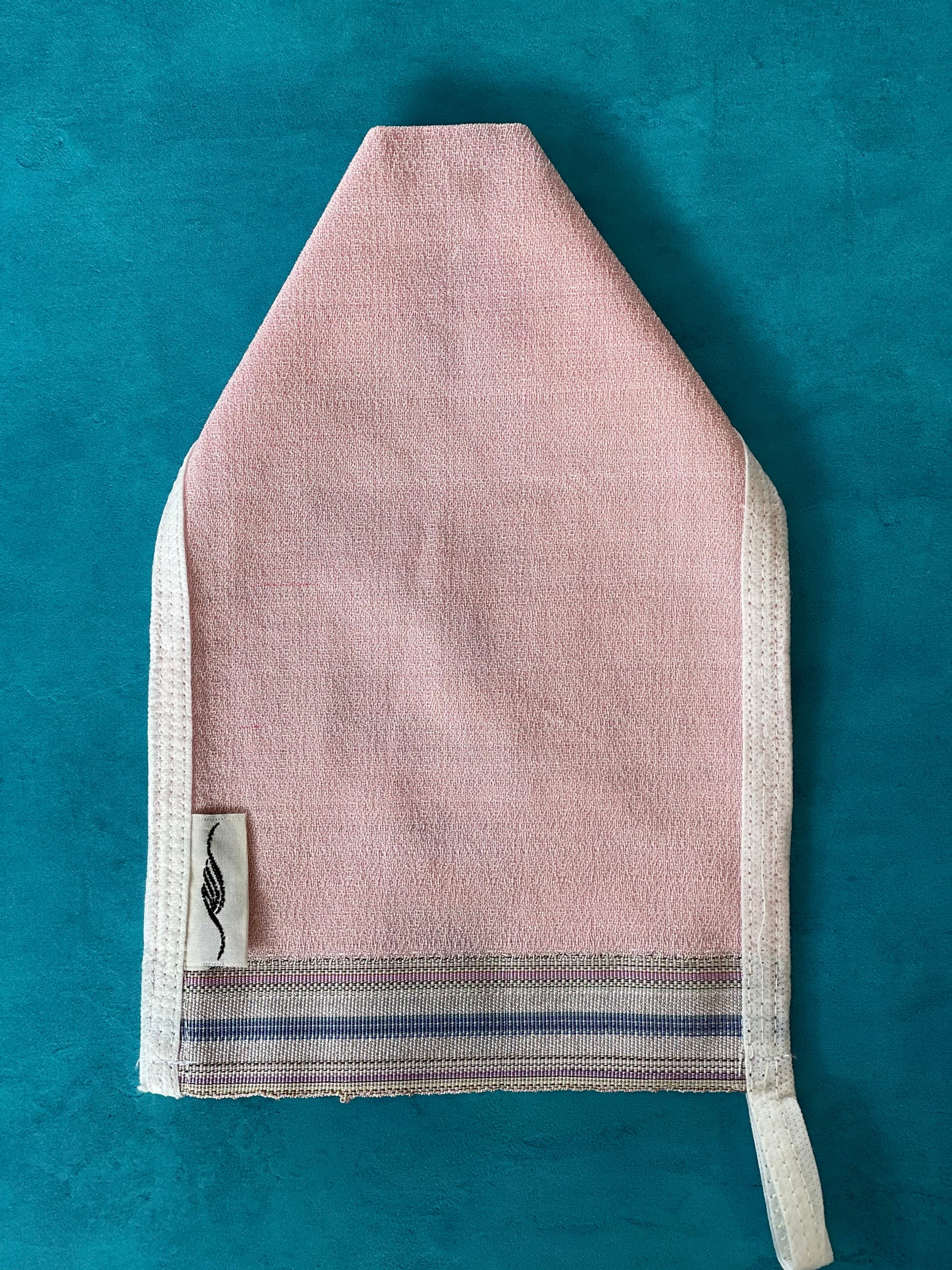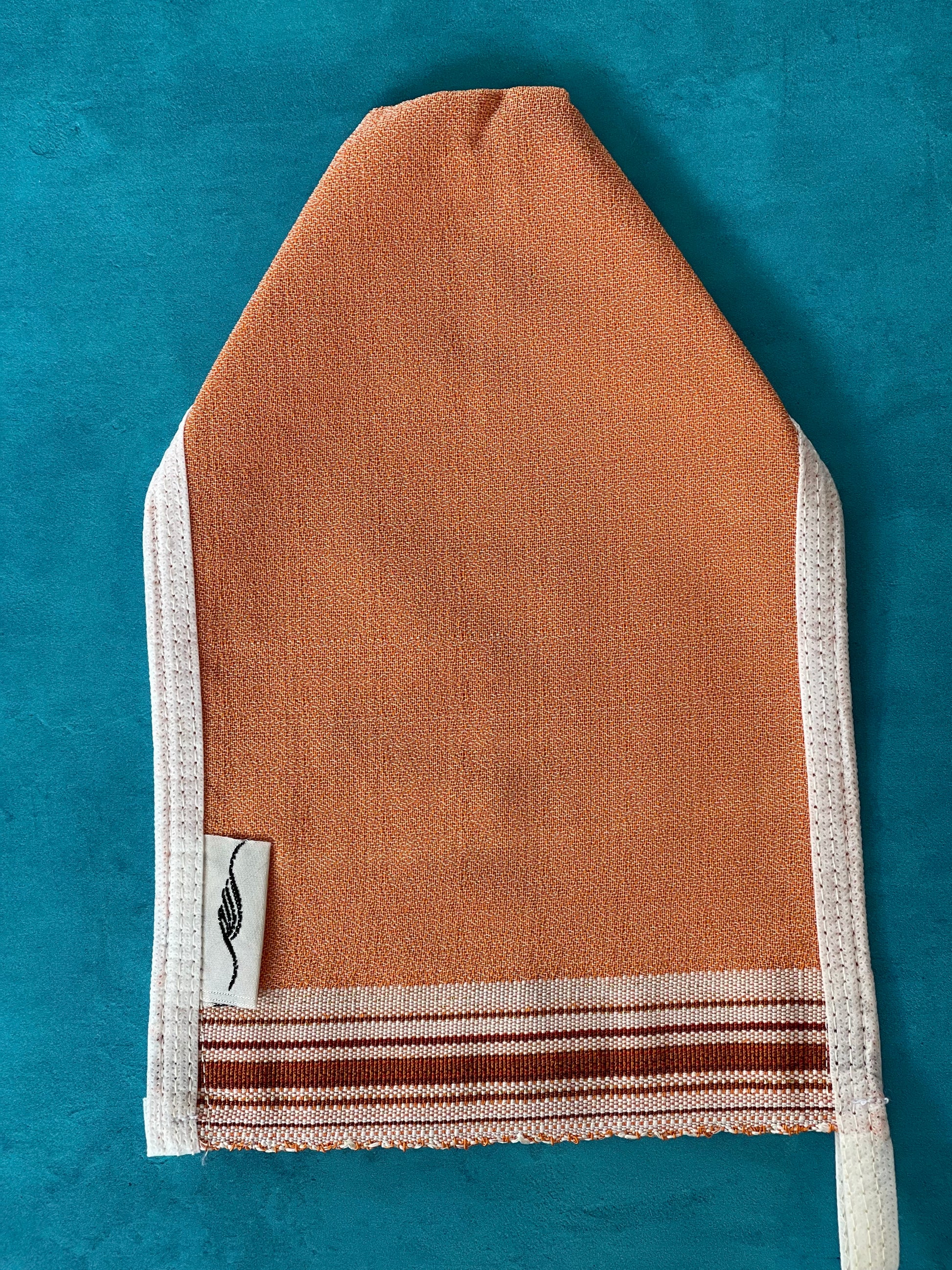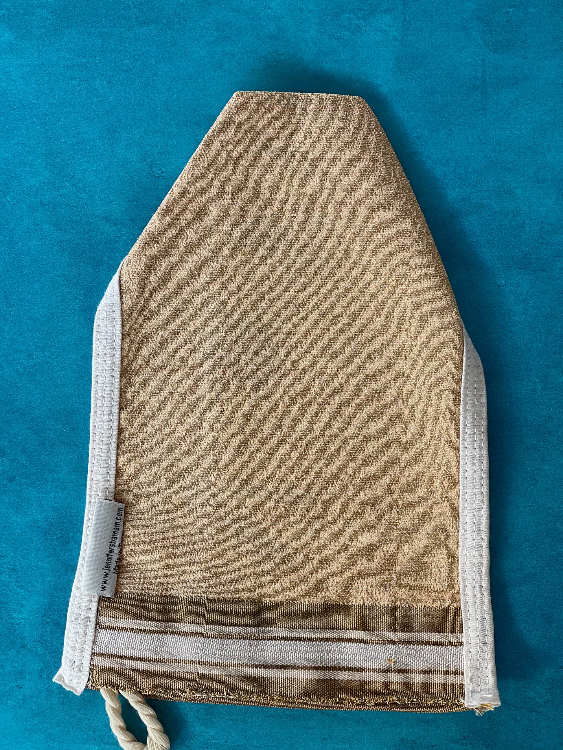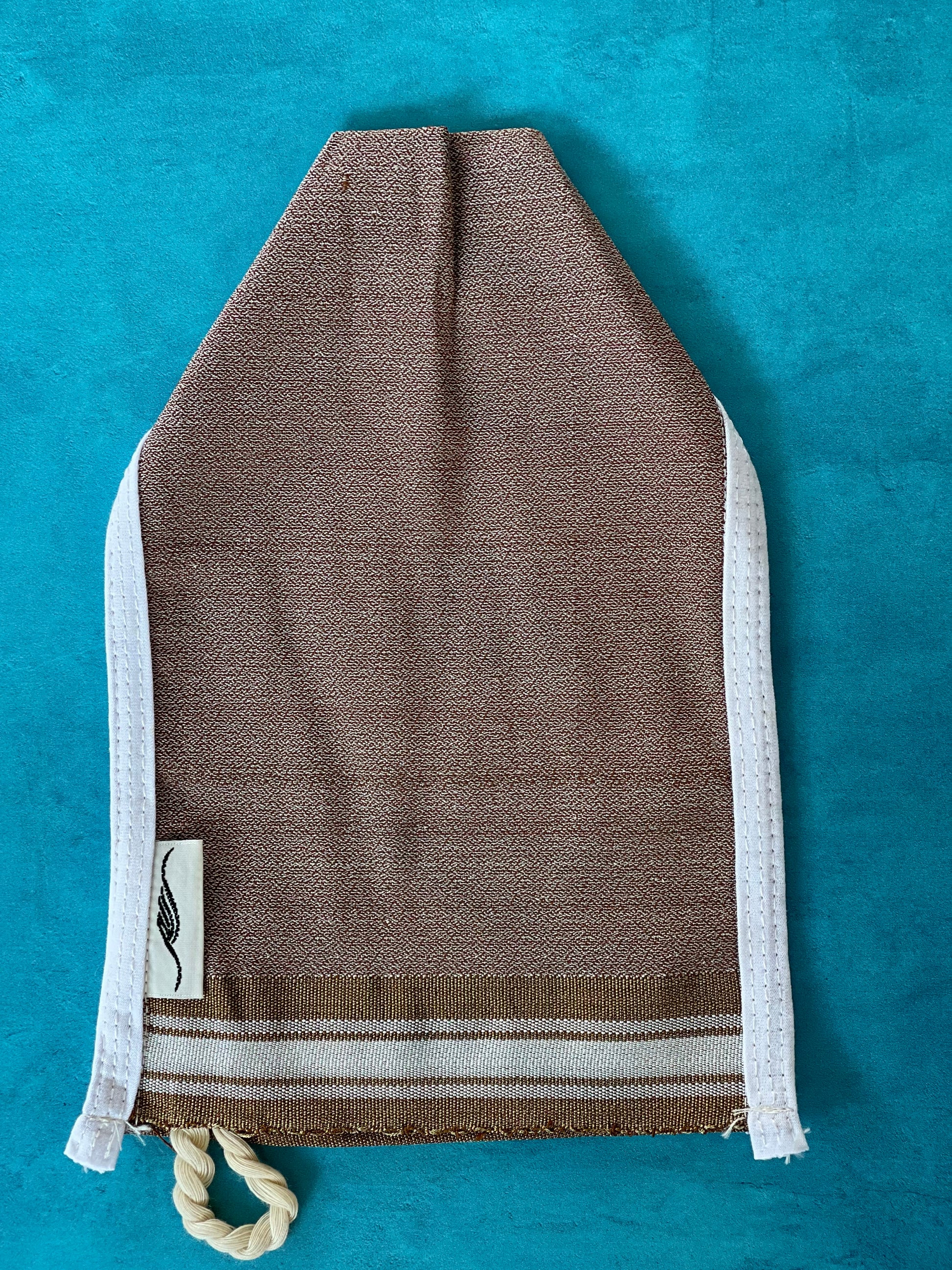 Body exfoliating kese (pronounced keh-say) mitt made from natural, organic tested materials (goat hair, silk, tree bark) and woven on an old style shuttled looms. First let your skin soften in the shower for 5-10 minutes, then slide your hand into the mitt and scrub your skin in long, even strokes to watch the dead skin slough off. Promotes cell turnover, brightens dullness, and reveals fresh skin. A staple of Turkish hamams, these mitts are handmade on a loom by a family in Istanbul.