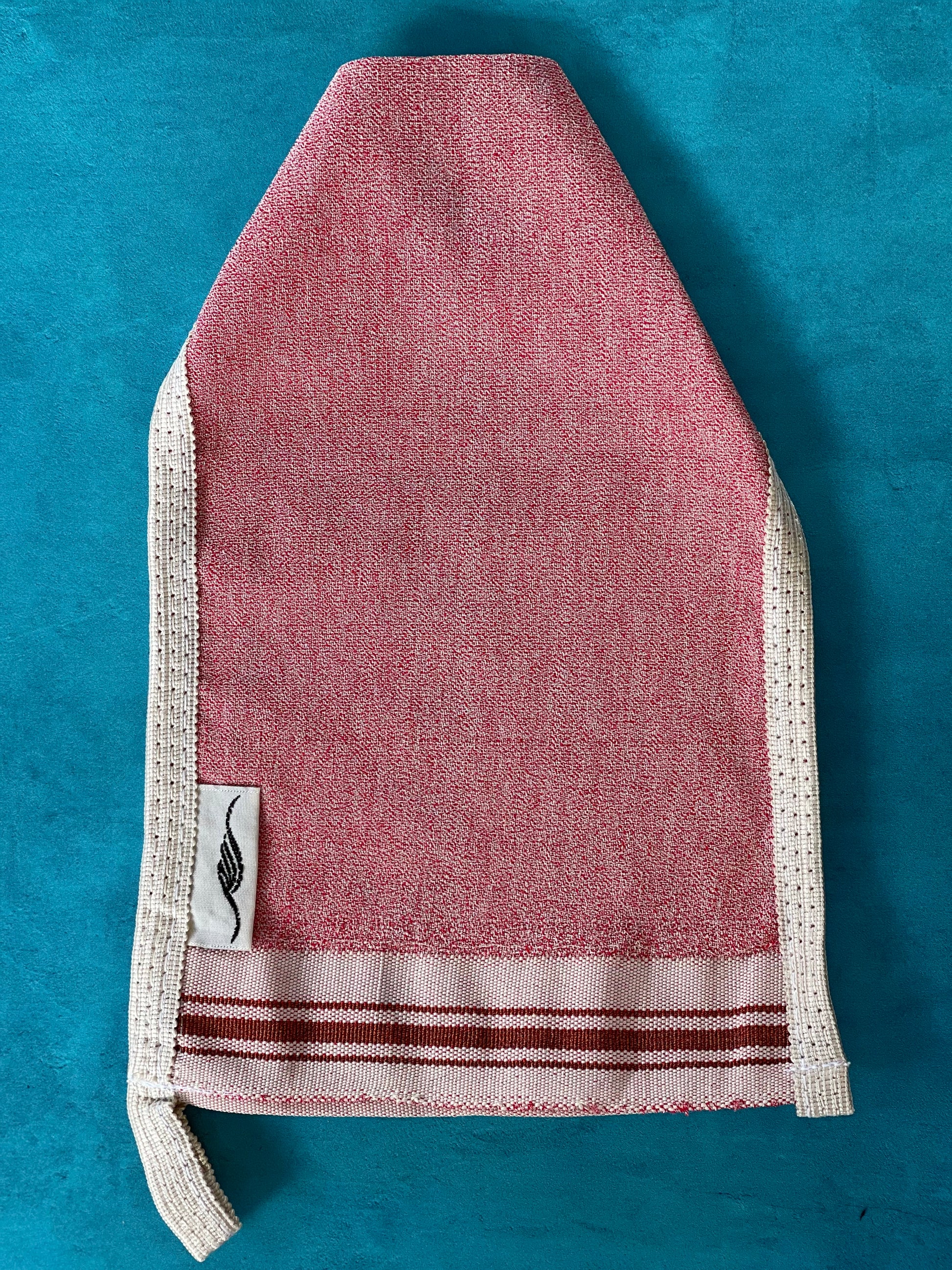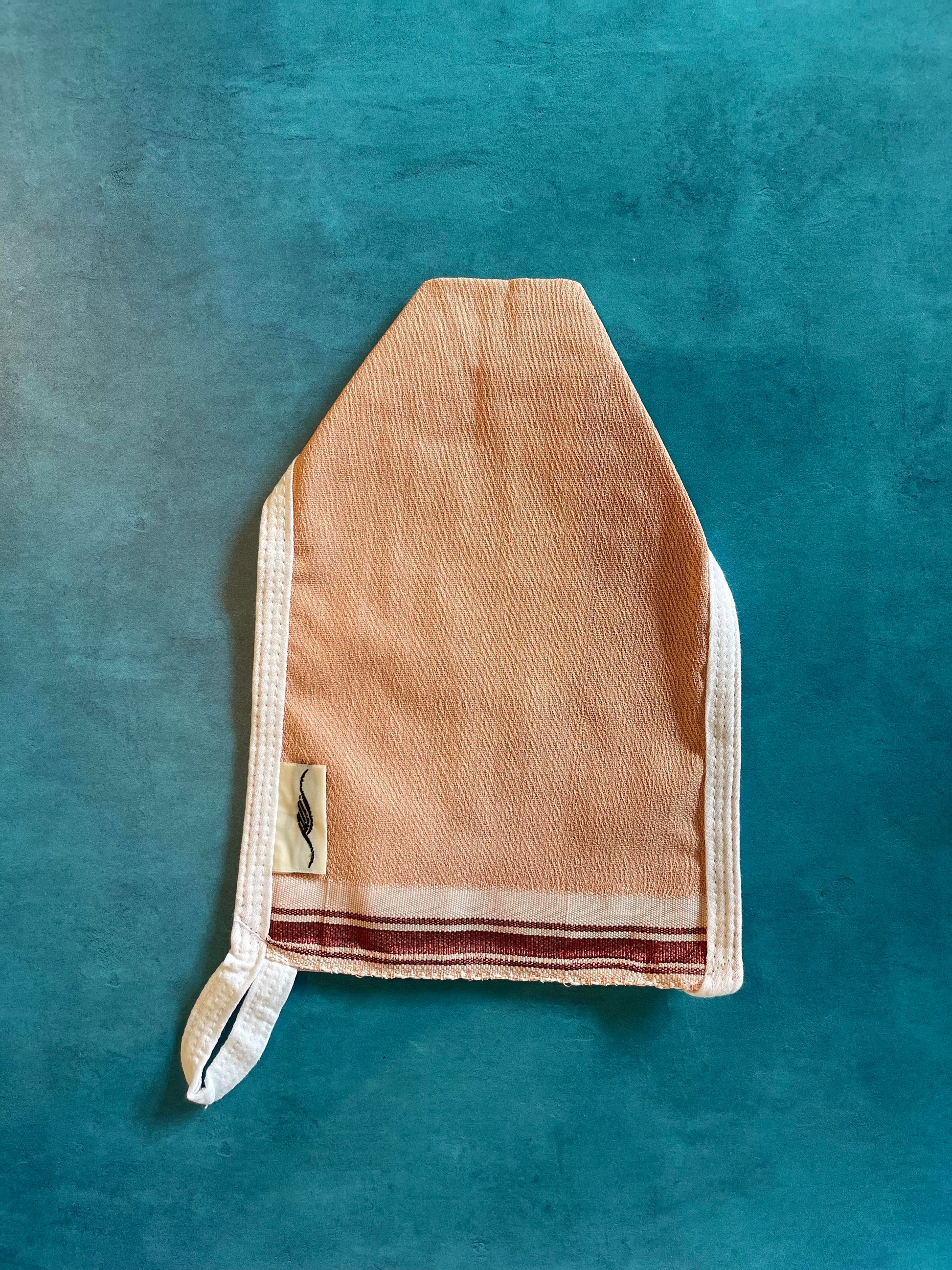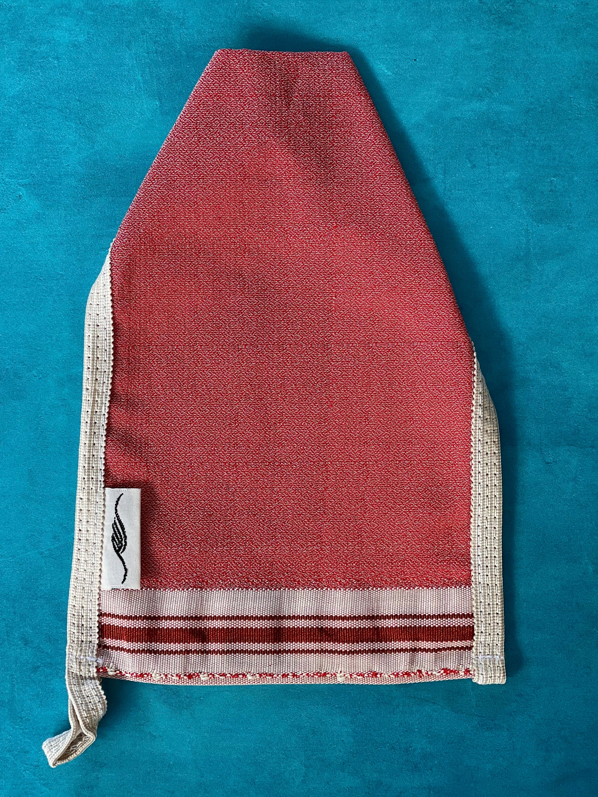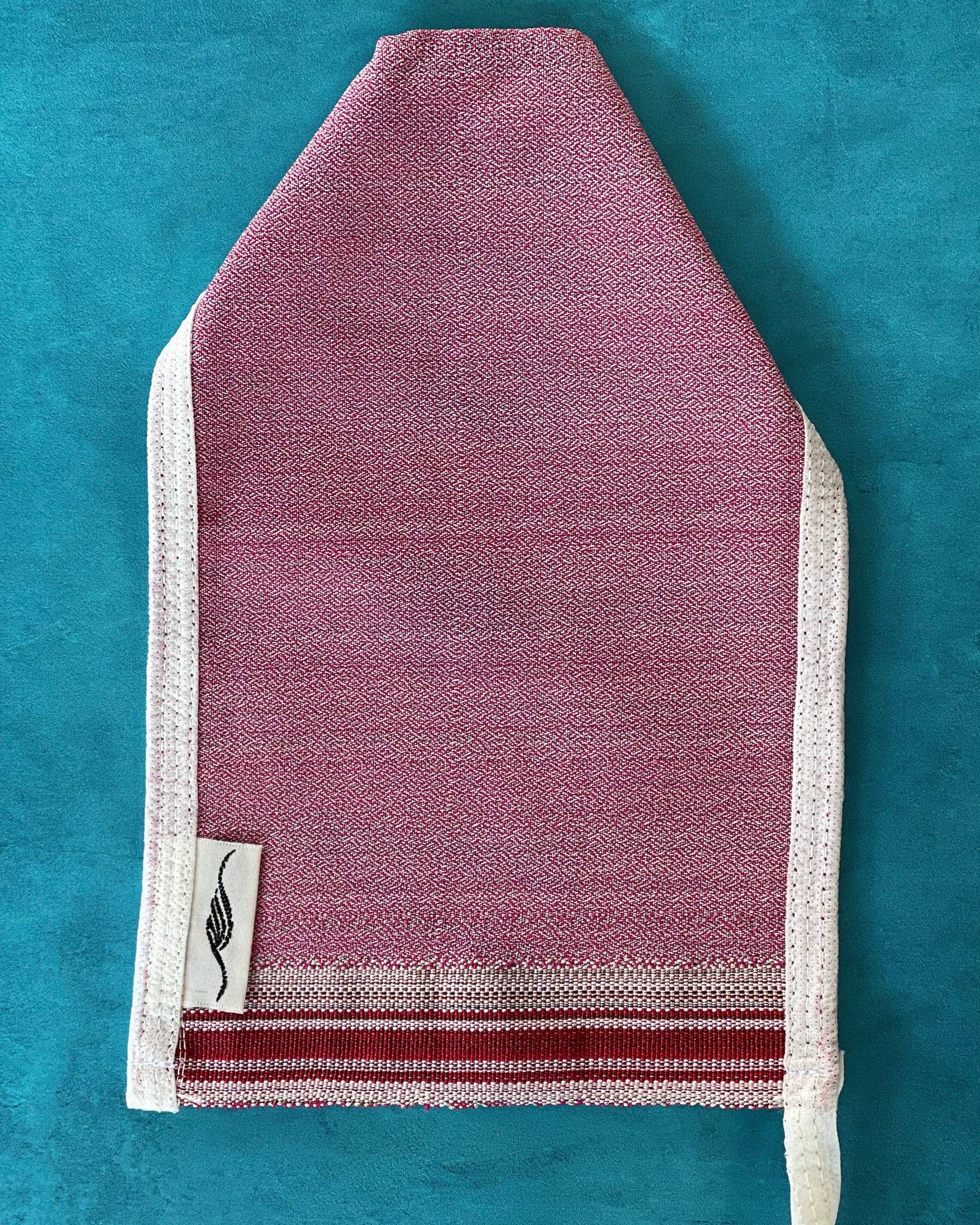 Body exfoliating kese (pronounced keh-say) mitt made from natural, organic tested materials (goat hair, silk, tree bark) and woven on an old style shuttled looms. First let your skin soften in the shower for 5-10 minutes, then slide your hand into the mitt and scrub your skin in long, even strokes to watch the dead skin slough off. Promotes cell turnover, brightens dullness, and reveals fresh skin. A staple of Turkish hamams, these mitts are handmade on a loom by a family in Istanbul.