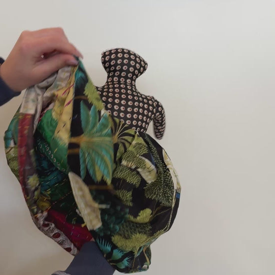 Made with love in India! One side has a skirt of hand block printed fabric made with natural dyes. The reverse side has a skirt made of hand stitched kantha fabric. Body fabric may vary.