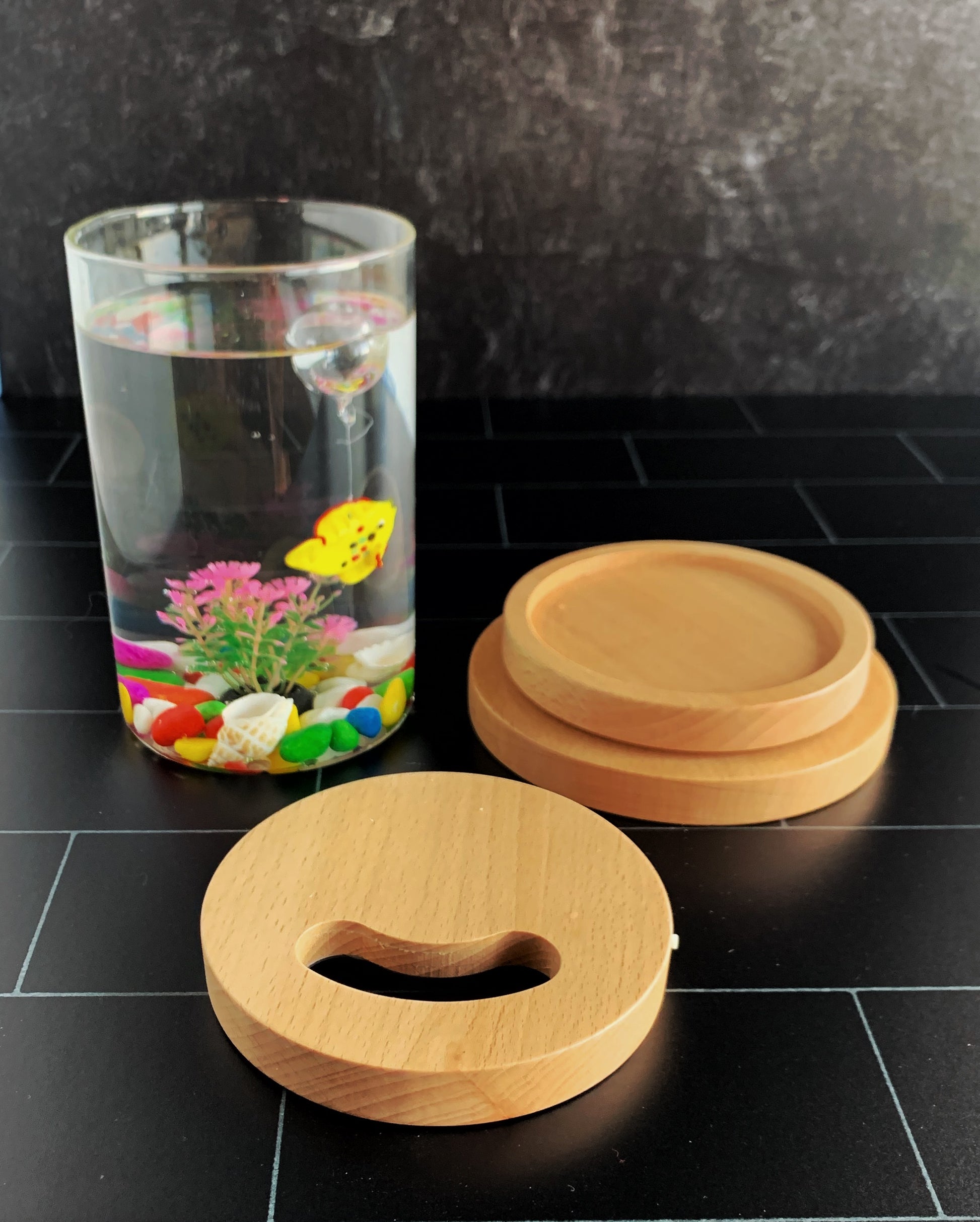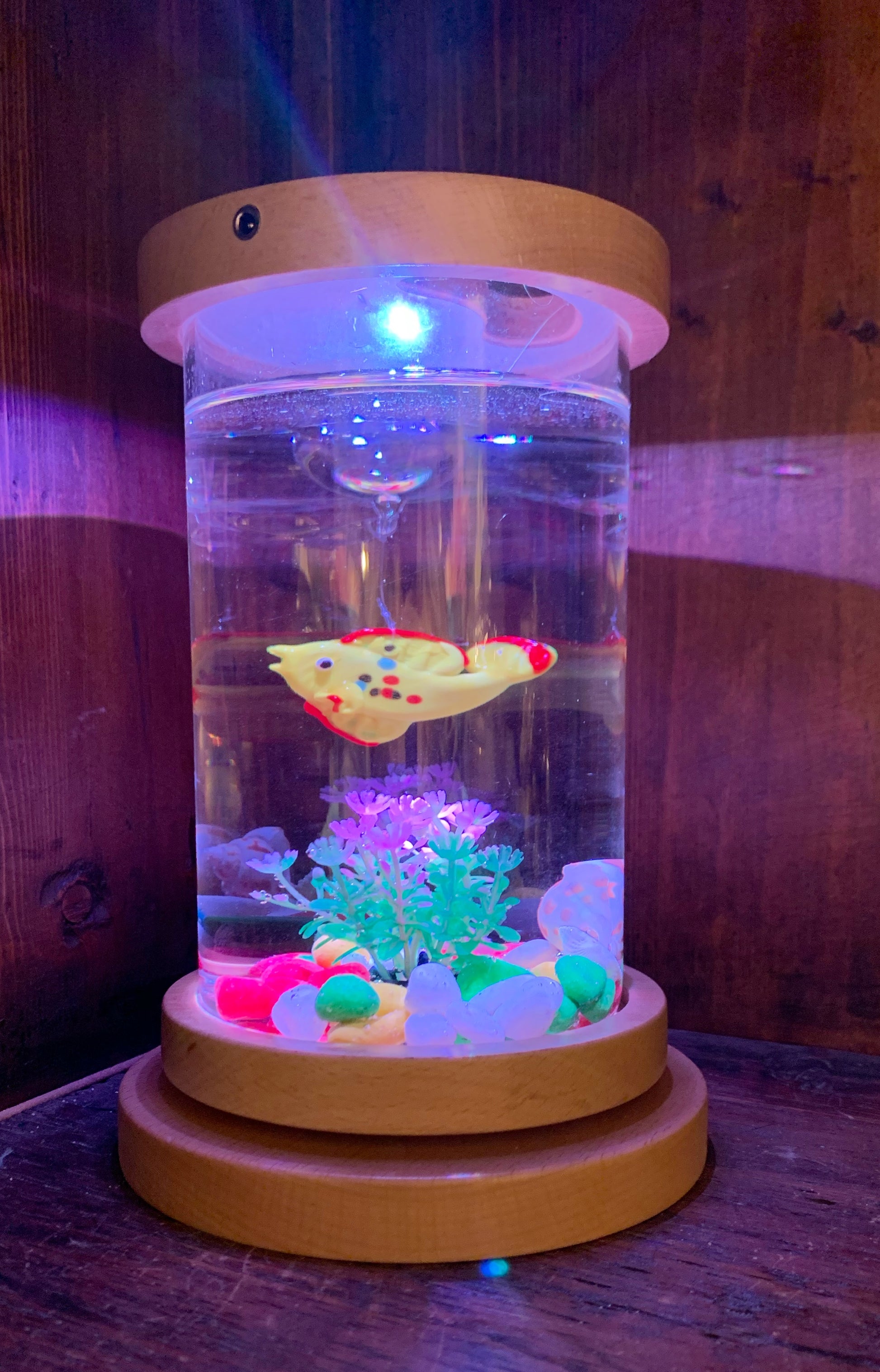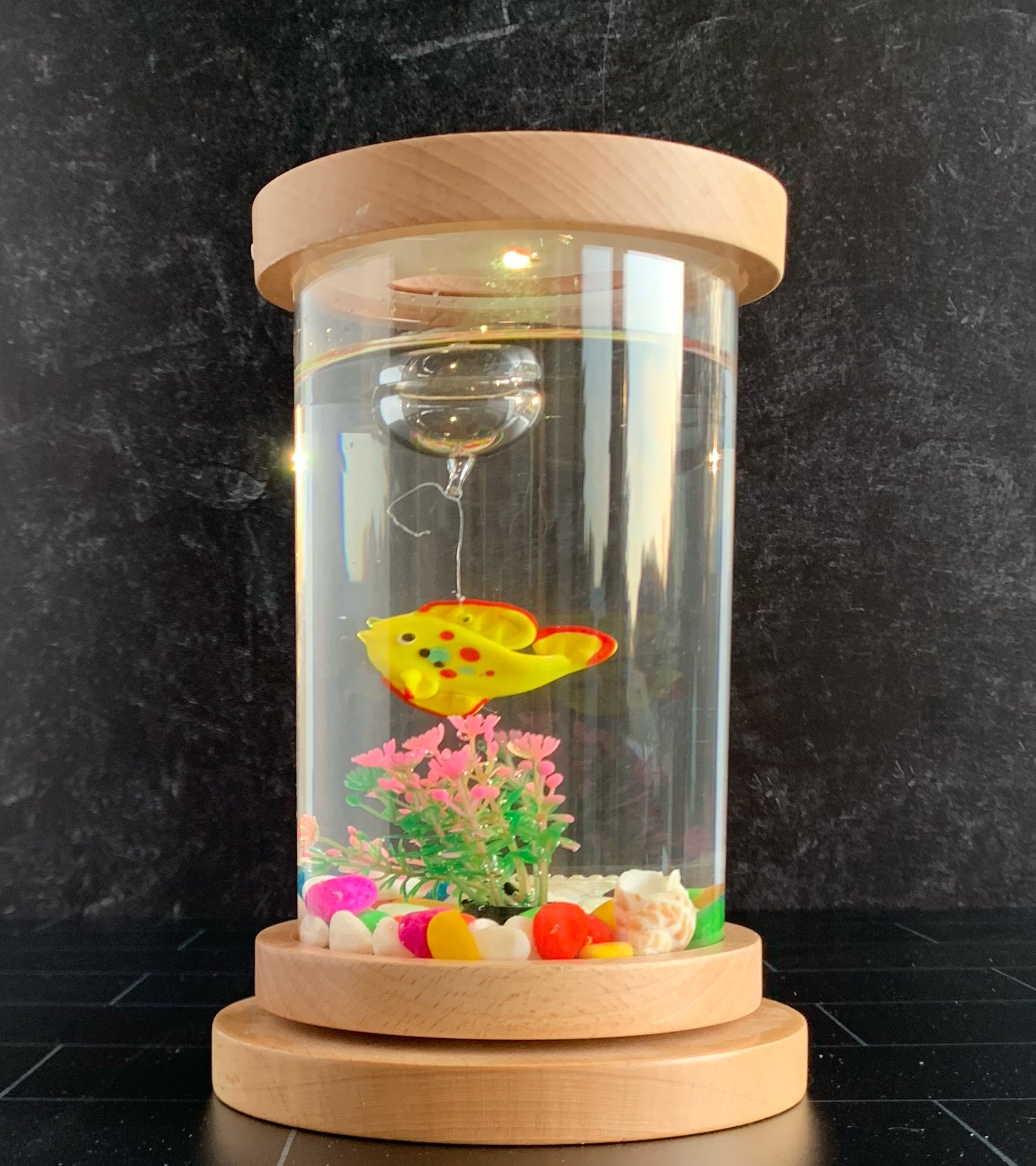 Sleek round desktop aquarium. It rotates 360 degrees and the glass is removable from the wooden base. It lights up and you can change the color to your mood. Comes with a USB cord so you can recharge easily when needed. We will include a blown glass fish you can use in your tank along with colored rocks, artificial plant and shells. Great home for a betta fish. Use on your desk and easy to care for and clean.