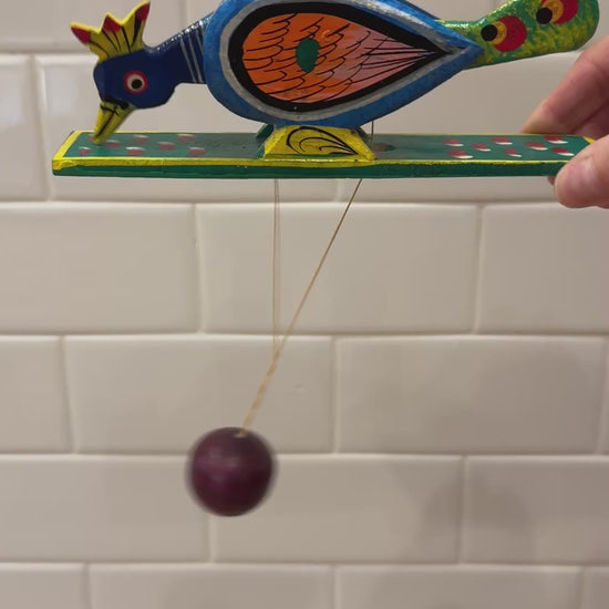 Experience nostalgia and joyful play with our Vintage Style Wooden Peacock Toy. Handcrafted with intricate details, this Indian-inspired toy brings a touch of culture to your child's playtime. When the ball is swung, it causes the Peacocks tail feather and head to move.
